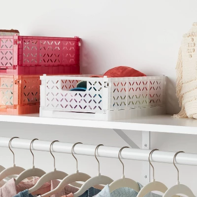 Add sleek storage to any space with this Medium Rectangular Plastic Foldable Crate from Brightroom™. This medium rectangular crate in a white hue features an allover cut-out cross pattern for textured appeal, integrating into a wide variety of decor styles. The plastic construction and open top provide easy access, while cut-out carrying handles make it a breeze to move around as needed. Plus, a foldable design helps save space when not in use.